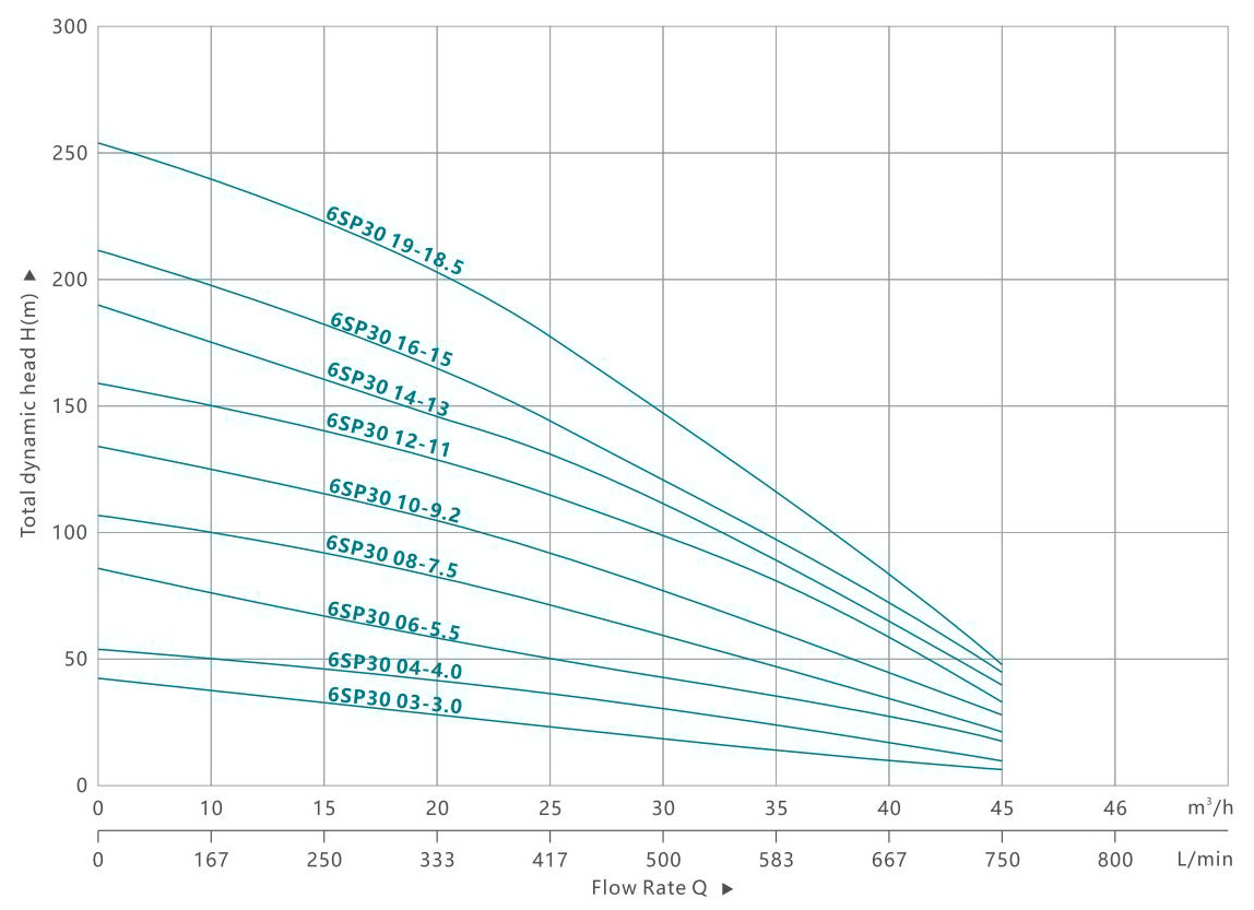 | 6SP30 03-3.0 | 3.0 | 4.0 | H(m) | 40 | 38 | 35 | 32 | 28 | 23 | 18 | 11 | 8 | 3 |