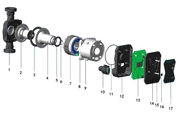 | 1 | Strehimi i pompës Shtytës Unazë magnetike Val Mbajtëse shtytëse Kushineta radiale Tufa me kushineta radiale Mbulesa e pompës Mëngë me unazë magnetike Paketa unaze magnetike |