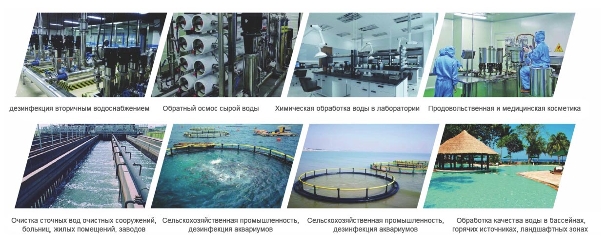 Sterilizimi i ujërave të zeza: objektet e trajtimit të madh dhe të mesëm, dezinfektimi laboratorik i ujit, ripërdorimi i ujit, ujërat e zeza mjekësore spitalore, pastrimi dhe dezinfektimi i ujit në pishinë, e kështu me radhë.