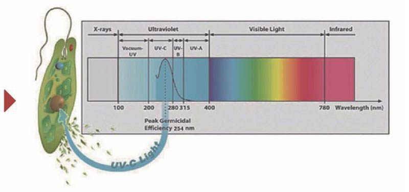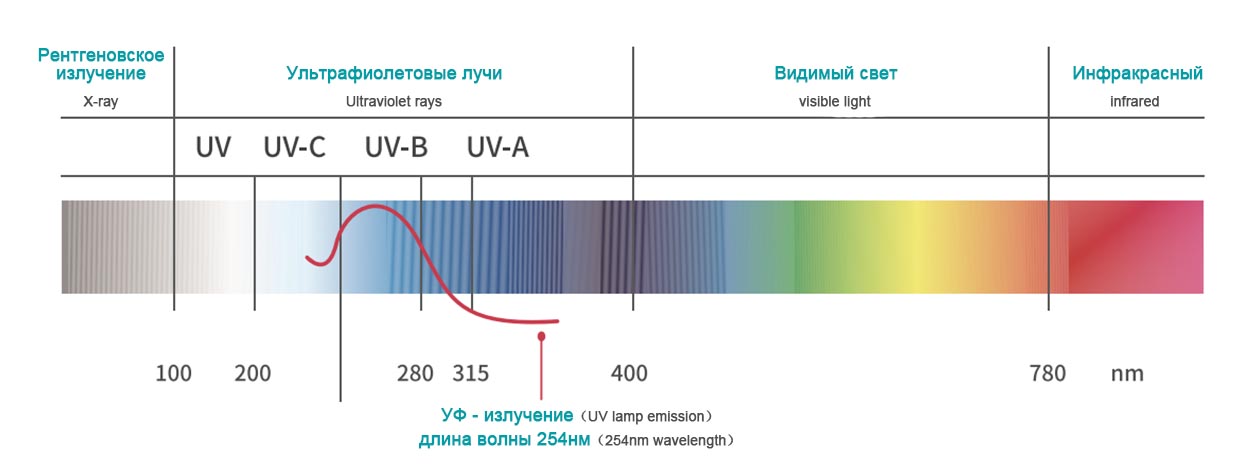 Rrezatimi UV ndahet në katër vargje: a / b / c / D. C - diapazoni ka një efekt baktericid. Nga këto, sterilizimi ultravjollcë është më i forti afër 254 nm.
