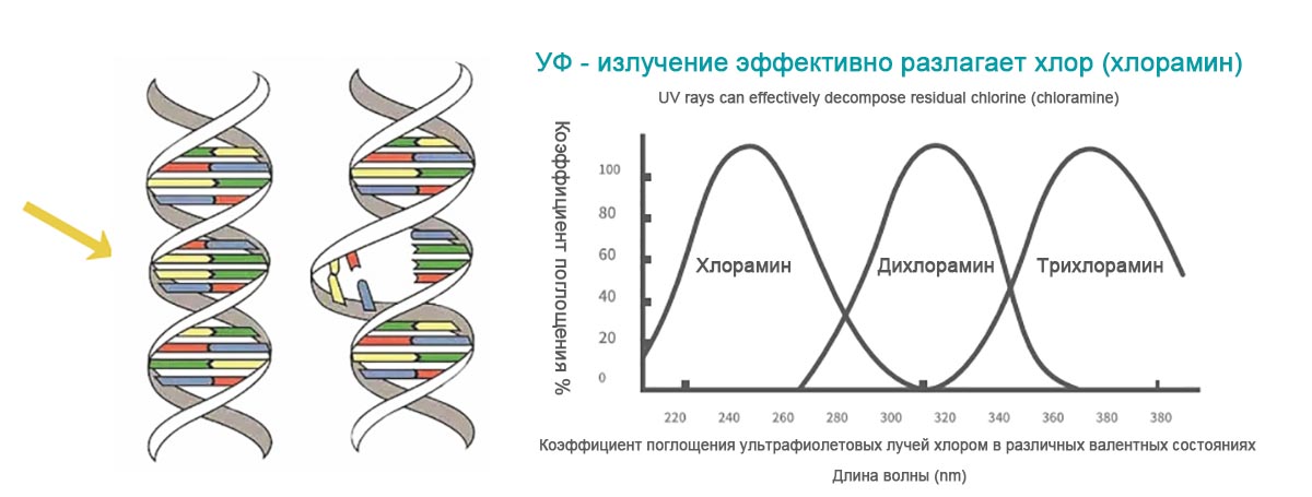 Krahasuar me klorin e mbetur (kloraminë), rrezet ultraviolet janë më të shëndetshme dhe nuk kanë efekte anësore; Teknologjia ultravjollcë e klorit të kombinuar (klorumi) e përftuar nga dezinfektimi me klor është shkaku i erës së klorit në ajër në pishina të mbyllura. Klohramina gjithashtu shkakton dhimbje në sy, dhe alergjitë në lëkurë janë gjithashtu shkaku kryesor i korrozionit të strukturave të përbëra në pishinat e mbuluara. Rrezet ultravjollcë jo vetëm që dekompozojnë kloraminë, por edhe pastrohen vetë. Asnjë mikrob nuk mund të jetë imun ndaj rrezatimit ultravjollcë, madje edhe disa patogjenë që klori nuk mund t'i vrasë.