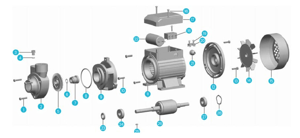 | 6 | Unazë mbajtëse | 16 | Bulon | 26 | Rotor |