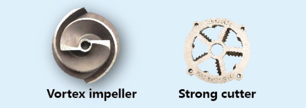 Shtytësi dhe tehu i pompës së ujërave të zeza prej gize me mulli WQAS të cilësisë së lartë ZEN janë prej çeliku inox me krom të lartë 420 me fortësi HRC49-52 dhe kanë rezistencë të mirë ndaj konsumit.