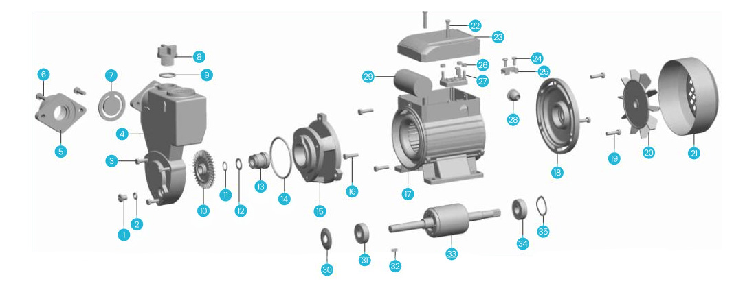 | 9 | Unaza "O". | 21 | Mbulesa e ventilatorit | 33 | Rotor |