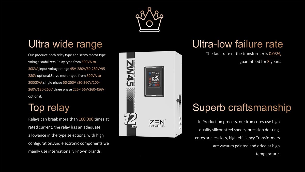 Rregullatori automatik i tensionit AC ZW60 1KVA deri në 30KVA është projektuar për jetë të gjatë shërbimi, ndërtim të fortë dhe komponentë me performancë të lartë. Karakteristikat e produktitKy model është një rregullator plotësisht automatik i tensionit të vogël 220 V i projektuar për ekran portativ dixhital LED. Ka karakteristikat e madhësisë së vogël, peshës së lehtë, rregullimit të shpejtë të tensionit, pa shtrembërim të formës së valës etj.