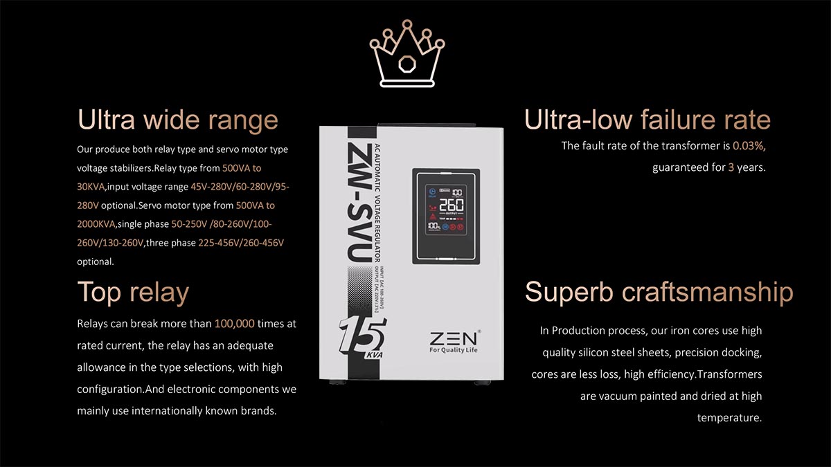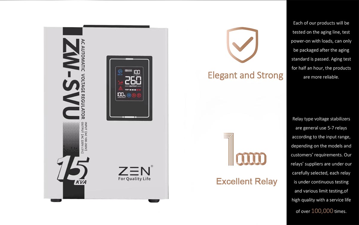 Rregullatori automatik i tensionit AC ZWSVU 15KVA me cilësi të lartë i fabrikës së makinerive ZEN është një prodhues dhe furnizues i famshëm në Kinë, i specializuar në prodhimin e Rregullatorit Automatik të Tensionit AC ZWSVU 15KVA me cilësi të lartë. Karakteristikat e produktitKy model është një rregullator plotësisht automatik i tensionit të vogël 220 V i projektuar për ekran portativ dixhital LED. Ka karakteristikat e madhësisë së vogël, peshës së lehtë, rregullimit të shpejtë të tensionit, pa shtrembërim të formës së valës etj.